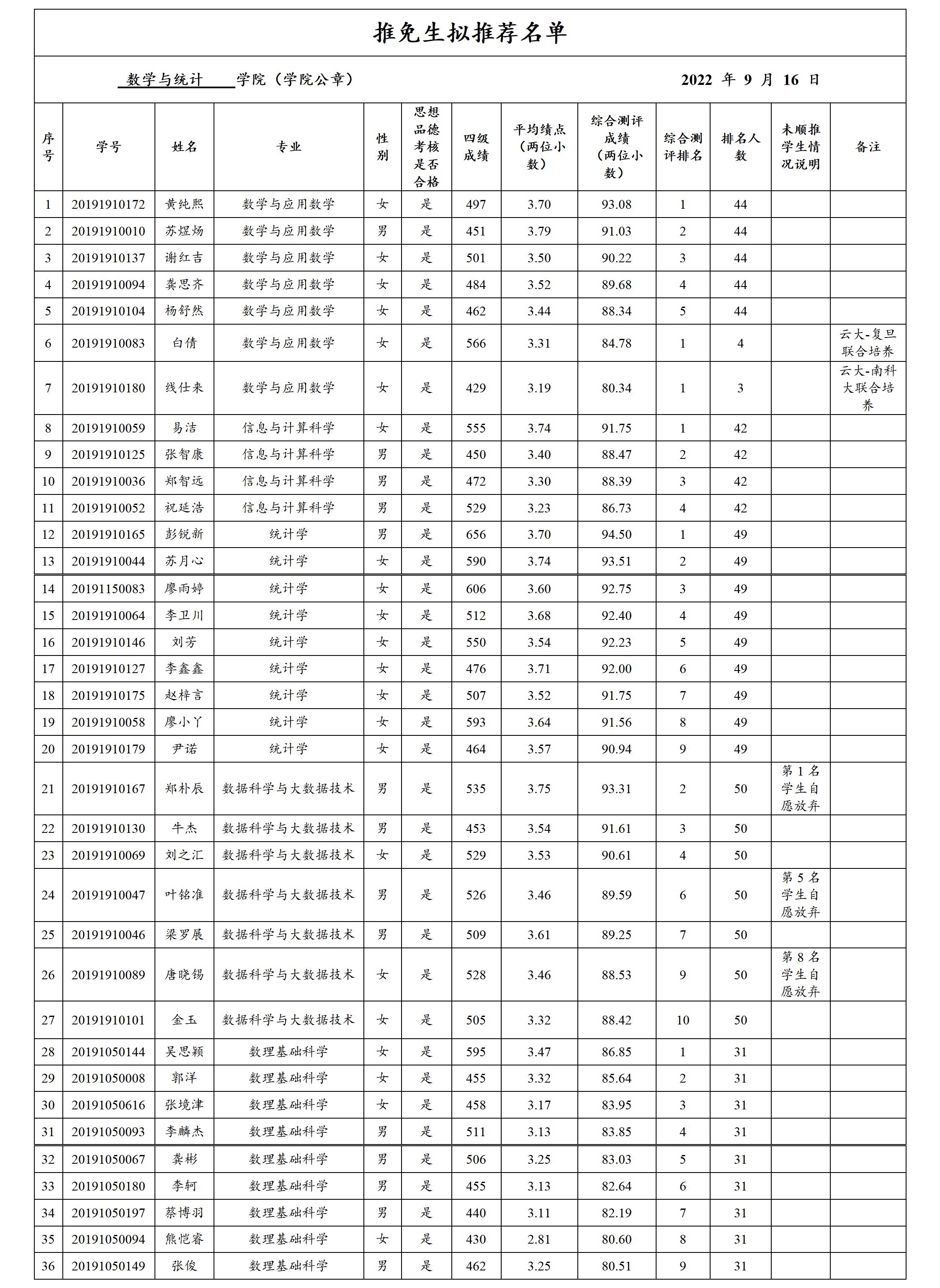 根据教育部相关文件精神,pg电子官网按照《pg电子中国官方网站2023年推荐优秀应届本科毕业生免试攻读研究生工作管理办法》要求,在学生本人申请、民主推荐、公开评选的基础上,学院推免生遴选工作小组本着公开、公平、公正的原则,严格按推荐条件择优确定初选名单,现将pg电子官网2023年免试攻读研究生拟推荐名单公示如下。如有异议,请于9月22日前到学院办公室反映,联系电话:0871-65031199 。