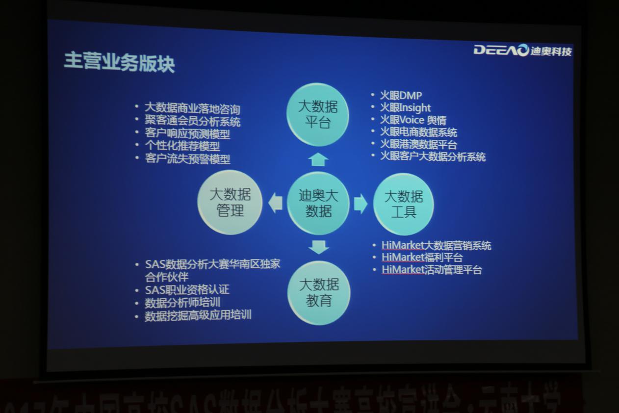 之后,赵老师向同学们介绍了“汇丰杯”中国高校SAS数据分析大赛并回顾了历届大赛,对2017年大赛的流程安排和奖项设置进行讲解。2017年大赛合作伙伴之一广州迪奥信息有限公司的员工方芳来到了宣讲会,向大家介绍了广州迪奥有限公司的主营业务板块以及SAS职业角色认证体系、SAS精英会和SAS大学-精英学院。