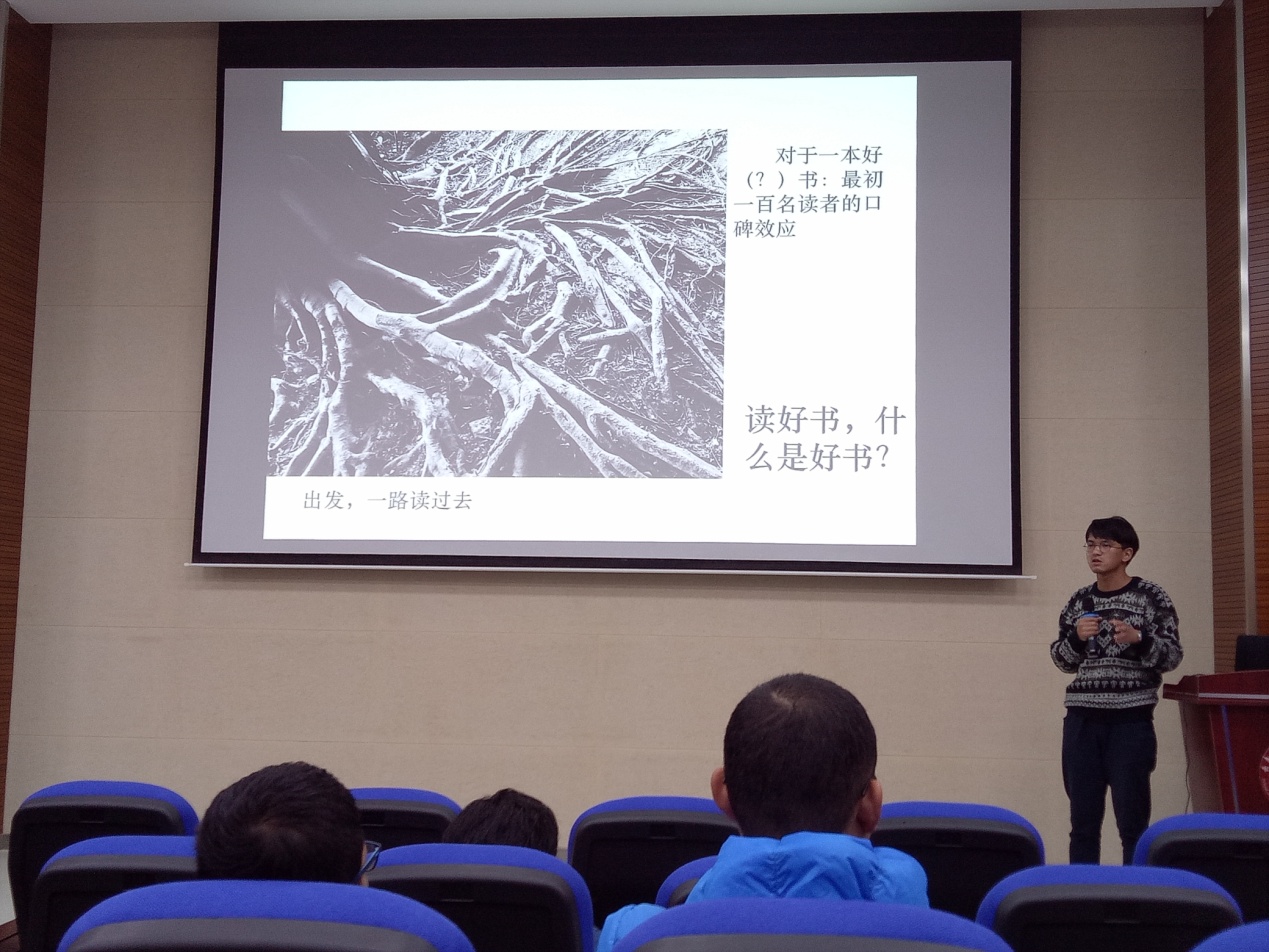 11月29日晚7点,pg电子官网邀请云南师范大学毕业生李诗白于格物楼3103报告厅开展了读书心得讲座。参加此次讲座的有2016级辅导员鲁学伟老师和2016级全体本科生。